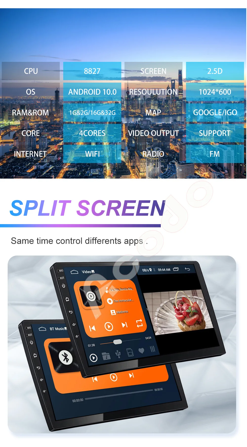 - Special Features: Built-in Gps,Charger,Mobile Phone,MP3 players,Voice Control,CarPlay,android auto,Reversing Input,Split Screen